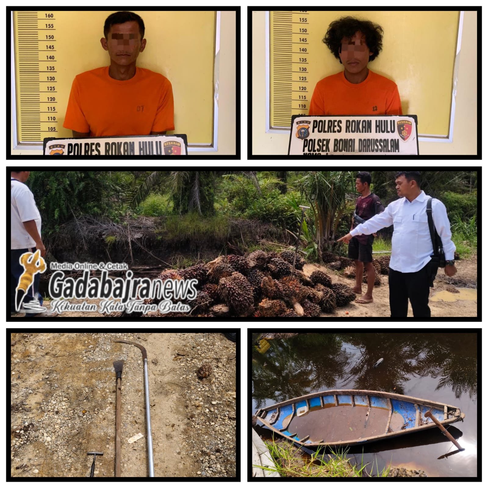 Dari tangan para pelaku, aparat kepolisian mengamankan barang bukti berupa 92 tandan buah kelapa sawit dengan total berat 950 kilogram, satu bilah egrek bergagang fiber, satu bilah dodos bergagang kayu, satu bilah tojok besi, serta satu unit sampan yang terbuat dari drum plastik warna biru. Seluruh barang bukti tersebut telah dibawa ke Polsek Bonai Darussalam untuk kepentingan penyidikan.