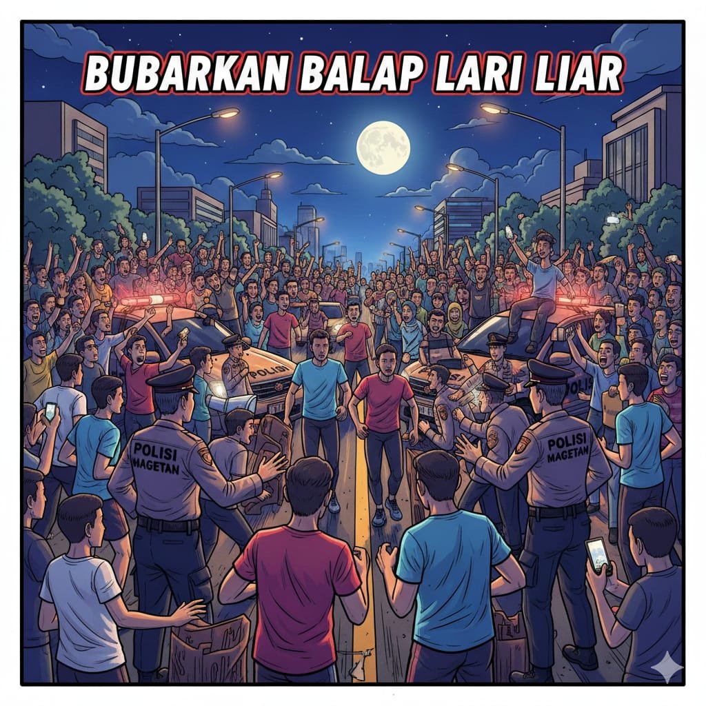 Magetan, Gadabajranews.com – Aksi balap orang yang viral di media sosial dan terjadi di Jalan Raya protokol Maospati–Magetan, tepatnya di Desa Sugihwaras, Kecamatan Maospati, pada Sabtu malam (21/2/2026), mendapat respons cepat dari jajaran Polres Magetan melalui Polsek Maospati.