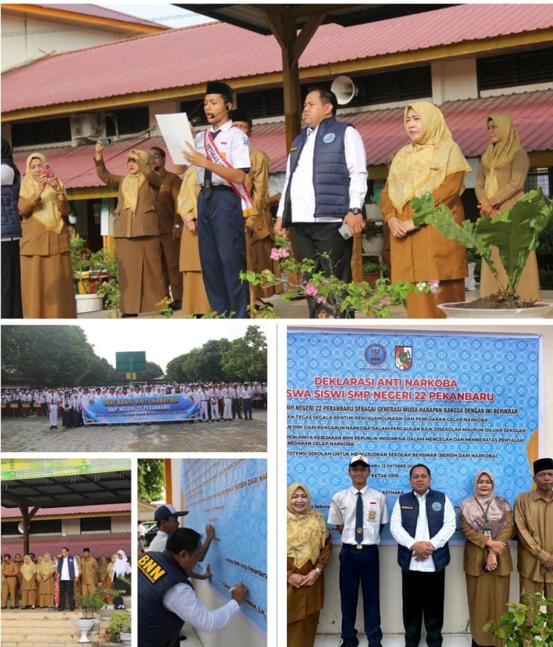 PEKANBARU, GadabajraNews.com — Dalam upaya memperkuat ketahanan generasi muda terhadap ancaman narkoba, Kepala Badan Narkotika Nasional Kota (BNNK) Pekanbaru, Kombes Pol Dr. Wawan, S.H., M.H., bertindak sebagai pembina upacara sekaligus narasumber sosialisasi bahaya narkoba di SMP Negeri 22 Pekanbaru, Senin (13/10/2025).
