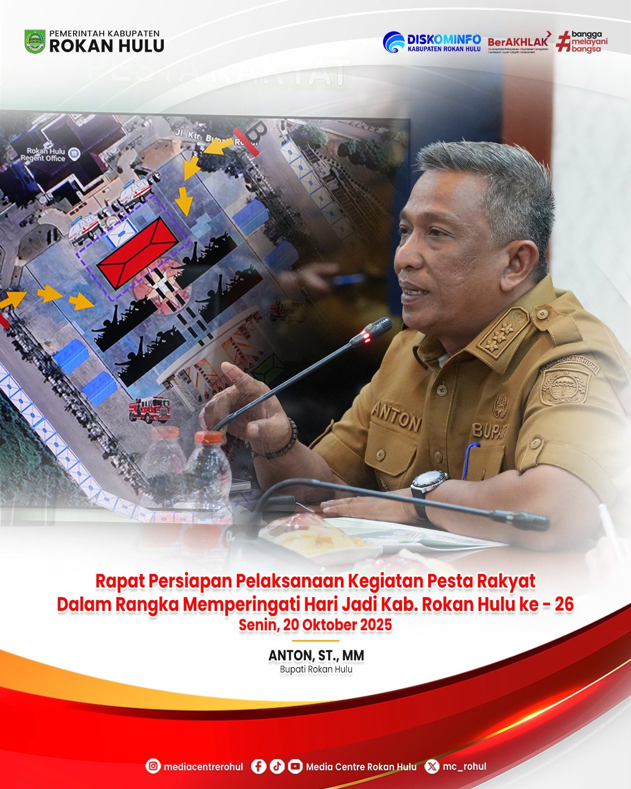 Rokan Hulu, Gadabajranews.com – Menjelang pelaksanaan malam puncak pesta rakyat dalam rangka Hari Jadi Kabupaten Rokan Hulu (Rohul) ke-26 tahun yang berlangsung pada tanggal 25 nanti, Bupati Rohul Anton, ST, MM memimpin rapat finalisasi persiapan di Ruang rapat Rumah Dinas Bupati, Senin (20/10/2025).