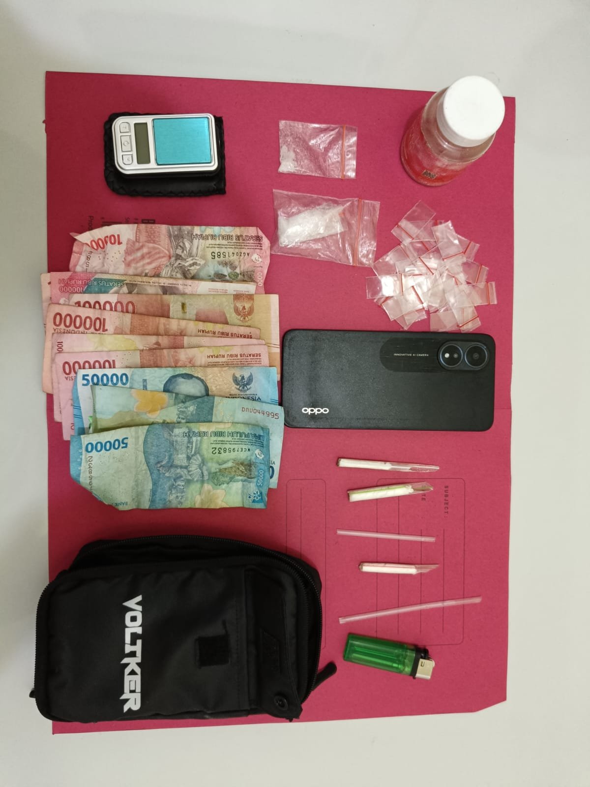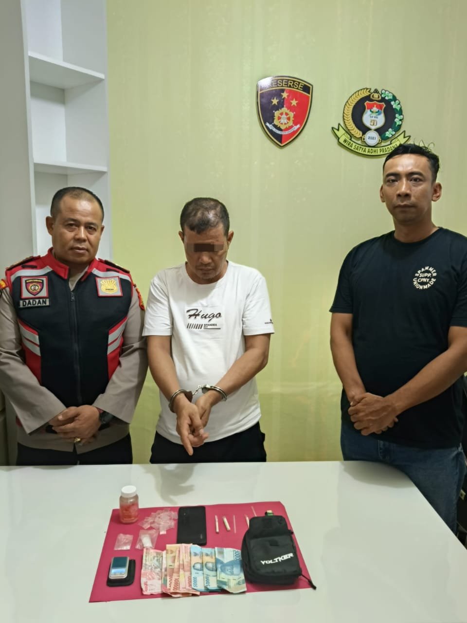 Dari tangan tersangka, polisi menyita barang bukti berupa 2 paket narkotika jenis sabu, 1 botol plastik bening, 45 lembar plastik bening ukuran kecil, 1 pcs timbangan digital, uang tunai senilai Rp 850.000, 1 buah tas kecil merk Voliker warna hitam, dan 1 unit HP Android merk Oppo warna hitam.