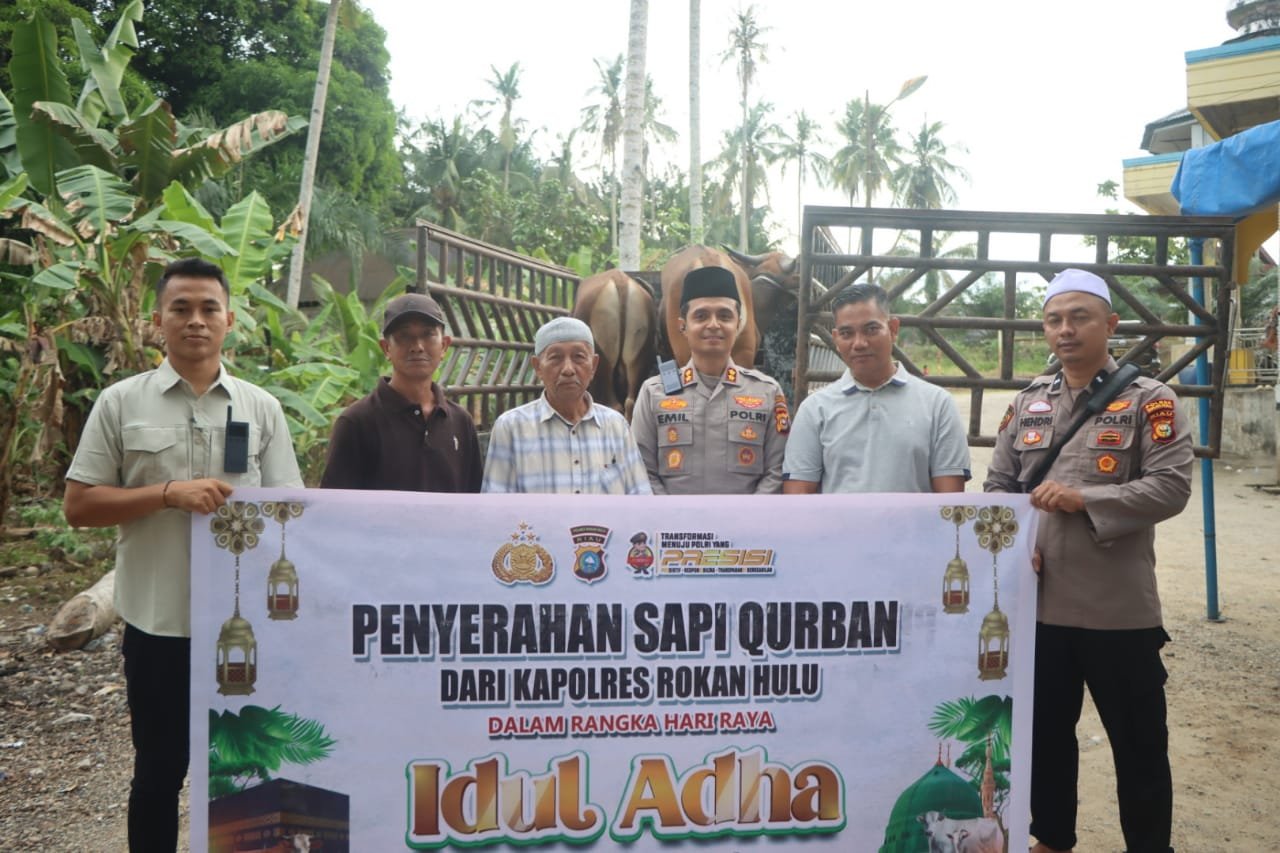 ROKAN HULU, GadabajraNews.com – Dalam rangka menyambut Hari Raya Idul Adha 1446 Hijriah, Polres Rokan Hulu (Rohul) menyalurkan bantuan hewan qurban ke masjid-masjid di berbagai desa di rokan hulu, Penyerahan dilakukan secara simbolis oleh Kapolres Rohul AKBP EMIL Eka Putra S.I.K, M.Si. Kamis (5/6/2025).
