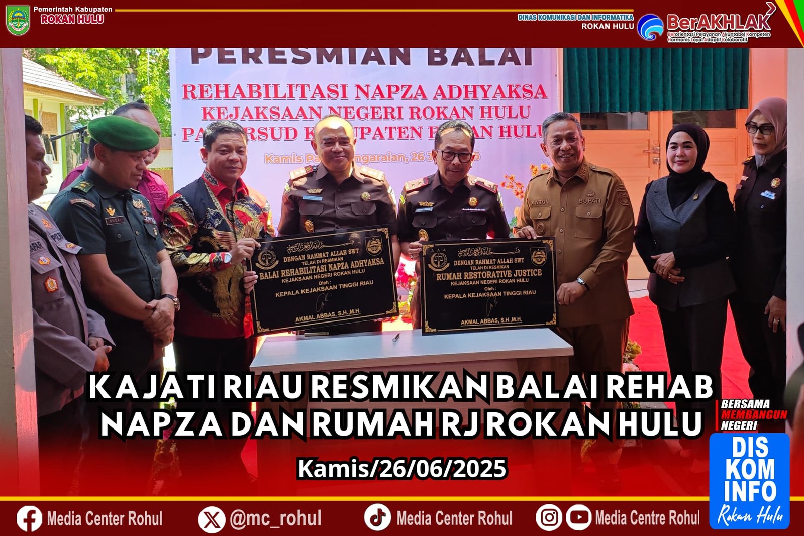 ROKAN HULU, GadabajraNews.com – Kepala Kejaksaan Tinggi (Kejati) Riau, Akmal Abbas, SH, MH beserta Rombongan melakukan kunjungan kerja ke Kabupaten Rokan Hulu dalam rangka Peresmian Balai Rehabilitasi Napza Adiyaksa dan Rumah RJ (Restorative Justice) bertepatan dengan Hari Anti Narkotika Internasional di RSUD Rokan Hulu, Kamis (26/06/2025).