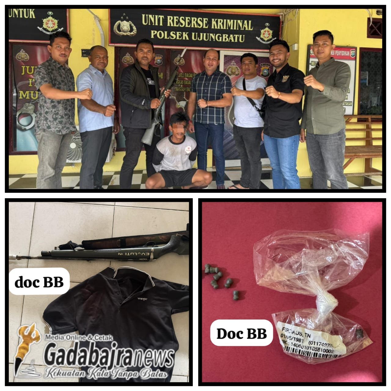 “Setelah kita pastikan lokasi persembunyiannya, tim langsung melakukan penangkapan. Dari tangan pelaku turut diamankan barang bukti berupa satu unit senapan angin warna hijau merek Evolution yang digunakan saat kejadian,” ungkap Kapolsek Ujungbatu.