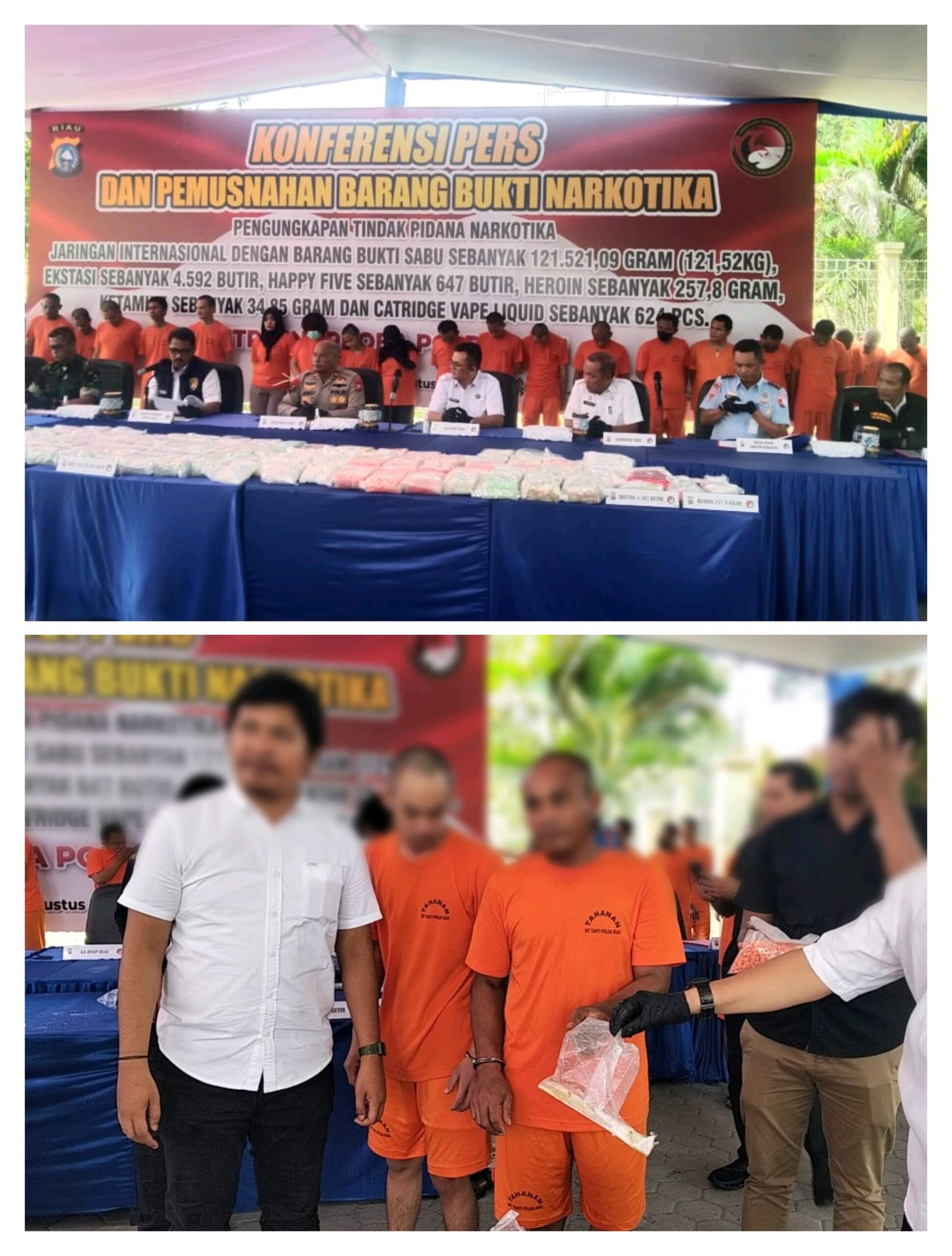 Sebanyak 34 tersangka terlibat dalam kasus ini, termasuk empat di antaranya perempuan. Pemusnahan dipimpin langsung oleh Wakapolda Riau, Brigjen Pol Jossy Kusumo, didampingi oleh Dirresnarkoba Kombes Pol Putu Yudha Prawira, Kabid Humas Kombes Pol Anom Karibianto, dan turut dihadiri sejumlah pejabat dari unsur pemerintah, TNI, kejaksaan, pengadilan, hingga otoritas keamanan bandara.