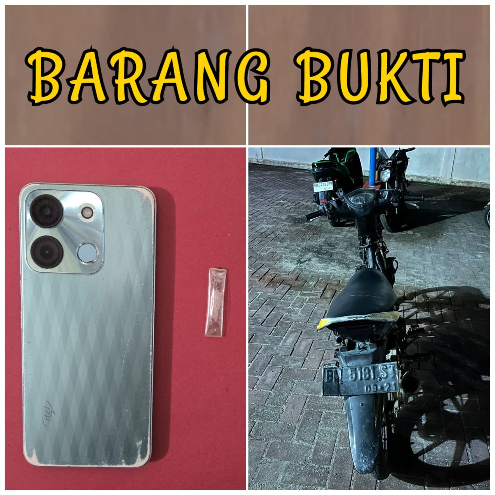 Selain sabu, polisi juga mengamankan barang bukti lain berupa 1 unit sepeda motor Yamaha Jupiter MX dengan nomor polisi BM 5181 ST yang digunakan pelaku, serta 1 unit handphone merek ITEL yang diduga berkaitan dengan aktivitasnya.