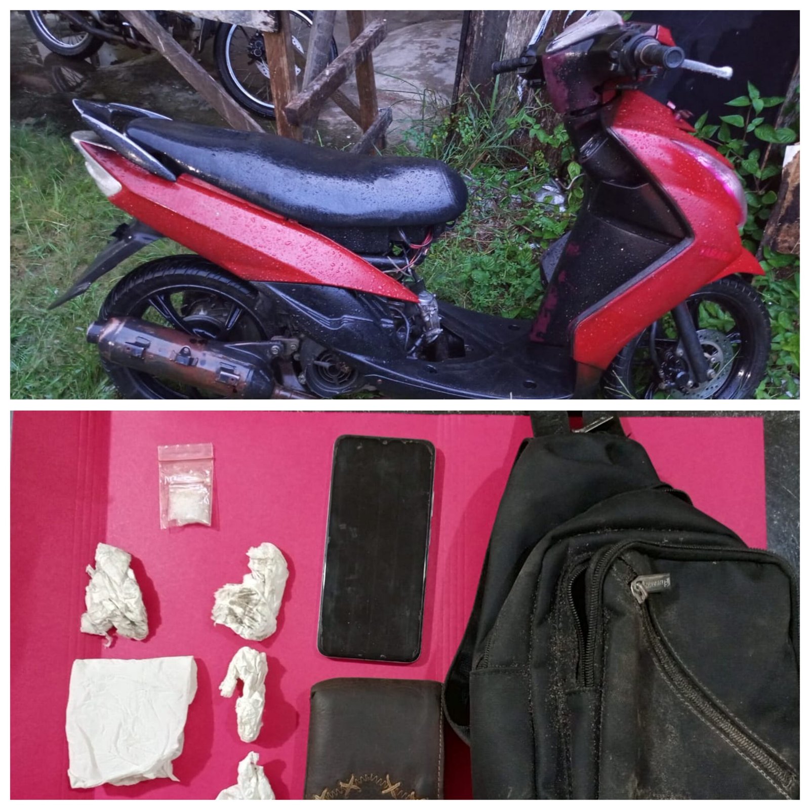 Dari tangan pelaku, polisi menyita barang bukti berupa 2 paket sabu, 1 unit handphone, 1 buah tas, dan 1 unit sepeda motor. Pelaku juga positif menggunakan narkotika jenis sabu berdasarkan hasil tes urine.
