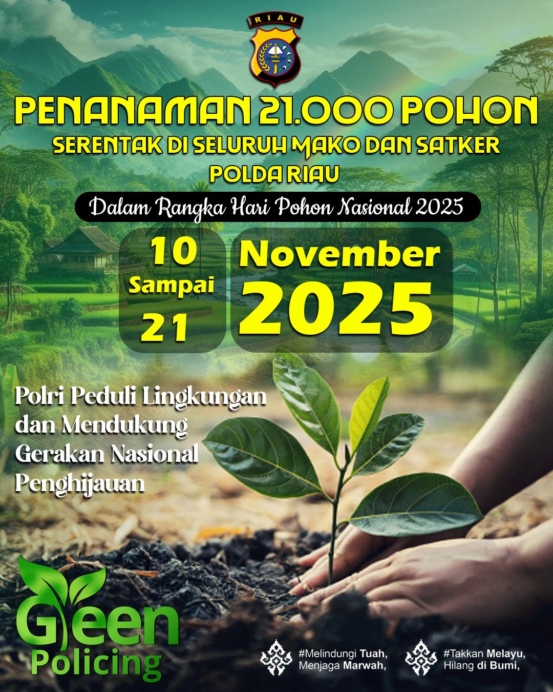 Dua agenda tersebut yakni Workshop Green Policing untuk 311 Ketua OSIS SMA/SMK/MA se-Riau pada 12–14 November, serta Program Penanaman Pohon Serentak sebanyak 21.000 pohon di seluruh Polres jajaran dan satker Polda Riau pada 10–21 November 2025 dalam rangka memperingati Hari Pohon Nasional.