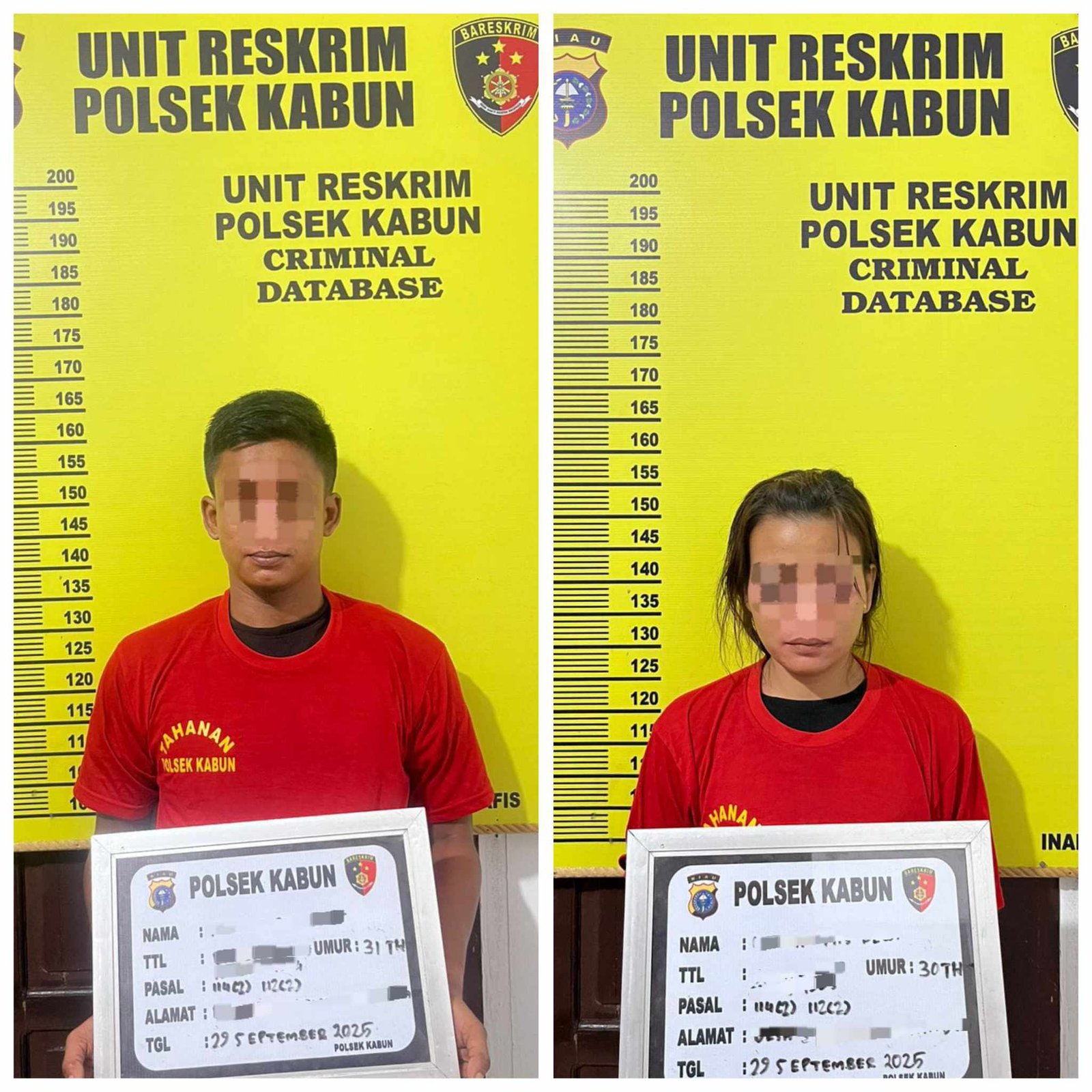 Tersangka diamankan setelah Polsek Kabun mendapatkan informasi dari masyarakat bahwa di Desa Bencah Kesuma sering terjadi peredaran gelap narkotika jenis sabu. Berdasarkan informasi tersebut, Kapolsek Kabun memerintahkan Kanit Reskrim untuk melakukan penyelidikan dan berhasil mengamankan kedua tersangka.