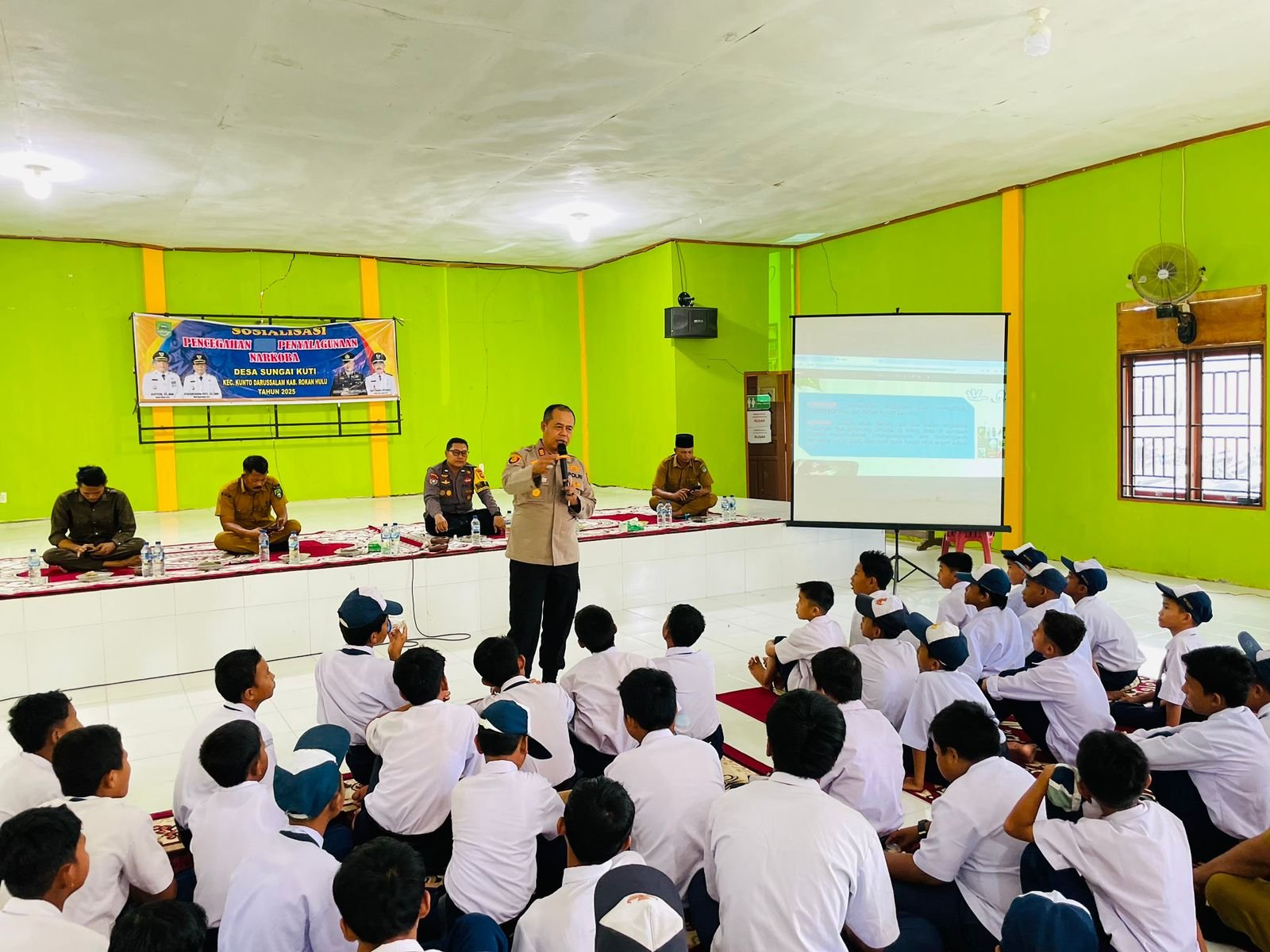 Hadir dalam sosialisasi tersebut Kepala Desa Sungai Kuti Sadiman Efendi, Bhabinkamtibmas Aipda Lindo Juanda, Banit IK Bripda M. Rayhandika, Wakil Ketua BPD Danu Prasetyo, guru-guru SMPN 8 Kunto Darussalam, serta sekitar 50 pelajar dari sekolah tersebut.