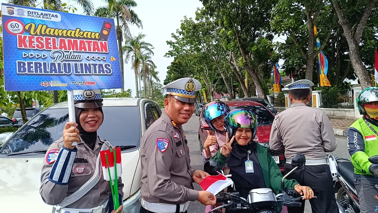 Kasubdit Kamsel Ditlantas Polda Riau, AKBP Dasril, menyampaikan bahwa kegiatan ini bukan sekadar pembagian bendera, tetapi juga momentum mempererat ikatan antara Polri dan masyarakat.