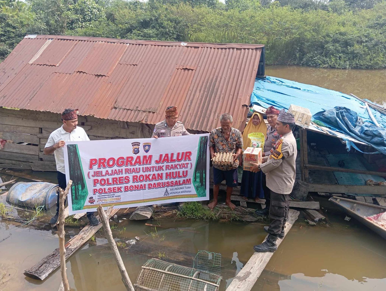 Dalam kegiatan tersebut, personel Polsek Bonai Darussalam yang dipimpin oleh AIPTU Jamal Medi Herianto, S.H bersama tim, turun langsung ke lapangan untuk menyapa masyarakat sekaligus menyerahkan bantuan kepada warga kurang mampu. Salah satu penerima bantuan adalah Merianto (63), warga setempat yang sehari-hari menggantungkan hidup dari aktivitas di Sungai Rokan.