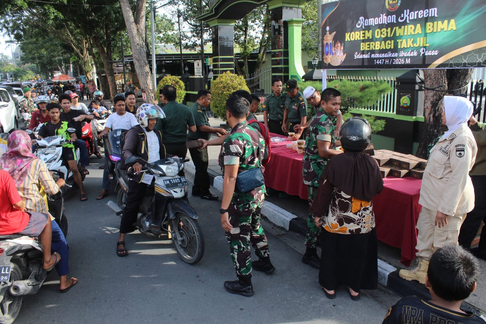 PEKANBARU, GadabajraNews.com – 24 Februari 2026 – Korem 031/Wira Bima melaksanakan kegiatan pembagian takjil kepada pengendara dan masyarakat yang melintas di depan Makorem 031/WB, Selasa (24/2/2026). paket takjil dibagikan menjelang waktu berbuka puasa.