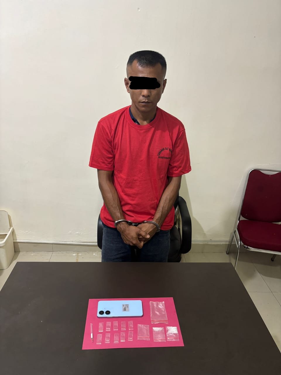 Dari Penangkapan, ditemukan barang bukti berupa 2 dua paket diduga Narkotika jenis sabu yang dibungkus Plastik klip warna Putih Bening, 12 dua belas lembar plastik klip warna putih bening, 1 (satu) buah sendok terbuat dari pipet plastik, 1 (satu) unit Handphone merk Realme warna biru muda.