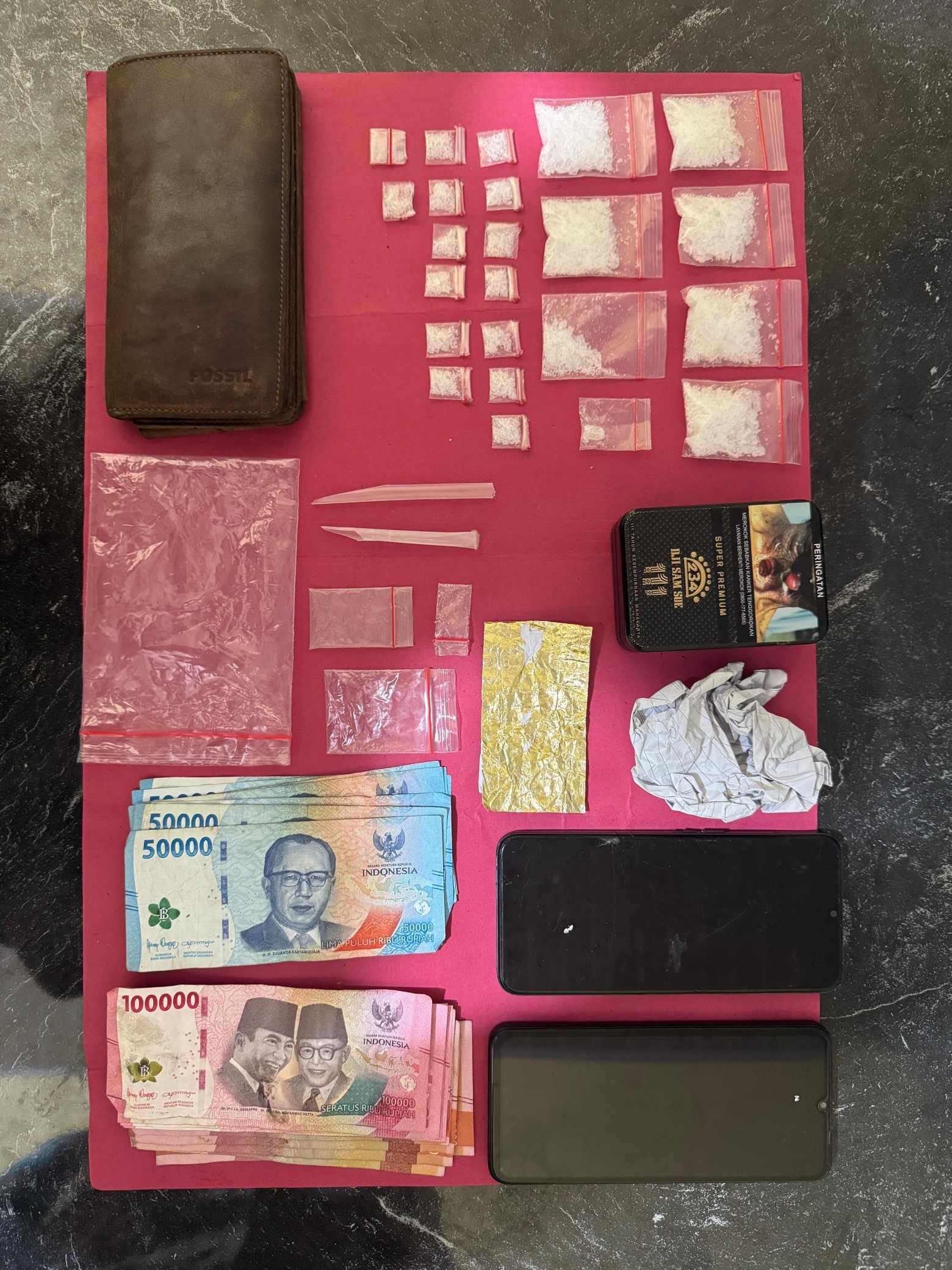 Dari hasil penggeledahan, petugas menemukan sejumlah barang bukti berupa 23 paket plastik klip bening berisi diduga narkotika jenis sabu, dua kotak rokok, sendok yang terbuat dari pipet plastik, plastik klip kosong, uang tunai sebesar Rp1.350.000, dua unit telepon genggam, serta barang pribadi lainnya. Barang bukti ditemukan di dalam rumah, gudang yang diduga digunakan sebagai tempat transaksi, serta dari penggeledahan badan salah satu terduga pelaku.