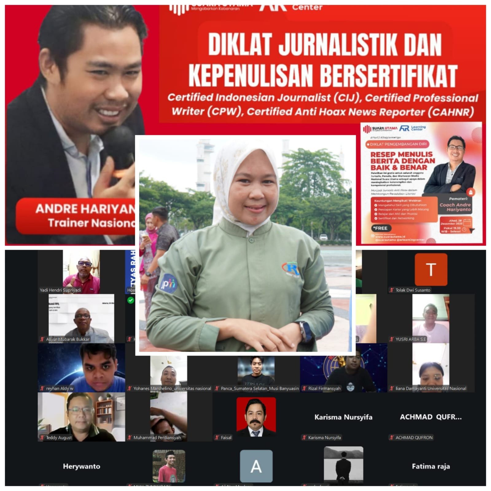 Dalam zoom meeting yang berlangsung Ahad malam, pukul 19.30 WIB , Trainer Nasional , sekaligus Pimpinan Redaksi Media SUARA UTAMA, Andre Hariyanto CIJ, CPW., bersama seorang narasumber Nurana Prasari,S.H. menyampaikan beberapa pembahasan penting dan akan diujikan kepada peserta Diklat , yakni: